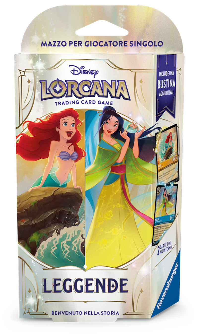 DATA DI USCITA INDICATIVA: FINE AGOSTO 2025Ogni mazzo per giocatore singolo di Disney Lorcana TCG include tutto ciò di cui un giocatore ha bisogno per iniziare a giocare, aprendo direttamente la scatola. Grazie a questi mazzi precostituiti, i giocatori possono avere un assaggio della ricca storia e dei vari personaggi di Disney Lorcana TCG. Sono disponibili due mazzi per giocatore singolo per il set Leggende di Disney Lorcana TCG. Ogni mazzo precostruito ha 60 carte e contiene carte di due tipi d’inchiostro, ciascuno con il suo particolare stile di gioco.